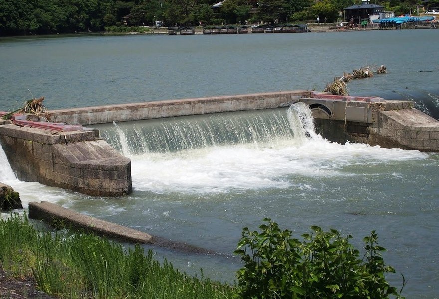 一ノ井堰(いちのいいせき)は桂川の水を田畑に送るため、古くは5世紀末に設けられた農業水利施設で嵐山の水面の風景の礎ともなっている。