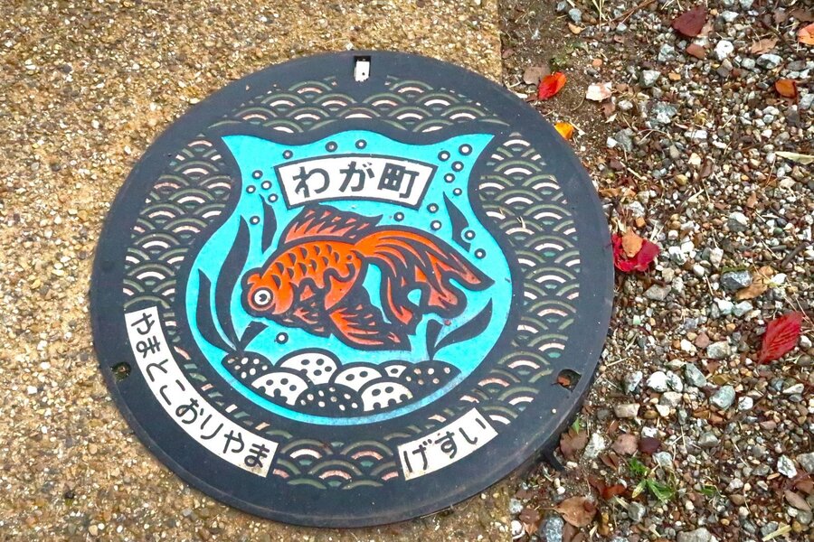 大和郡山はお城と金魚のまちとして有名ですが、来年の大河ドラマ「豊臣兄弟!」を先取りして、主人公・豊臣秀長の居城の郡山城を訪問。公園の周辺で「金魚が水槽で泳ぐ様子を図案化した」マンホールが目にとまりました。デザインは同じながら配色の異なる3種類あり。一方お城のデザインがないのはやや寂しい。