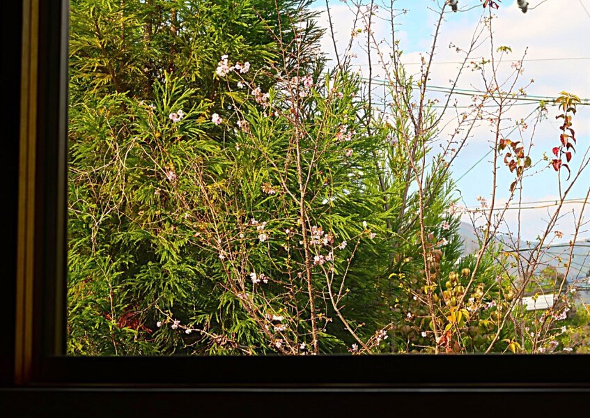 2階の部屋の窓から眺める「十月桜」