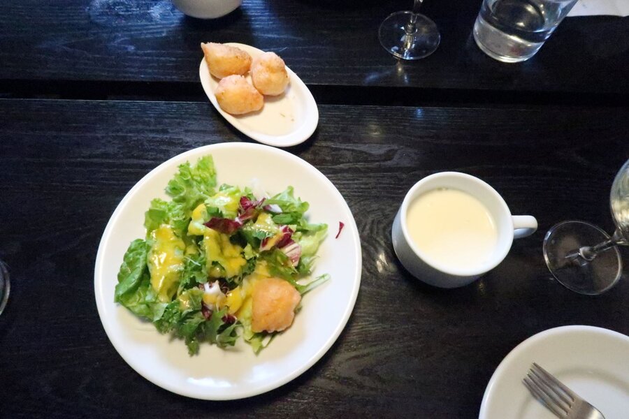 紅ショウが入りフリッターとサラダとスープ