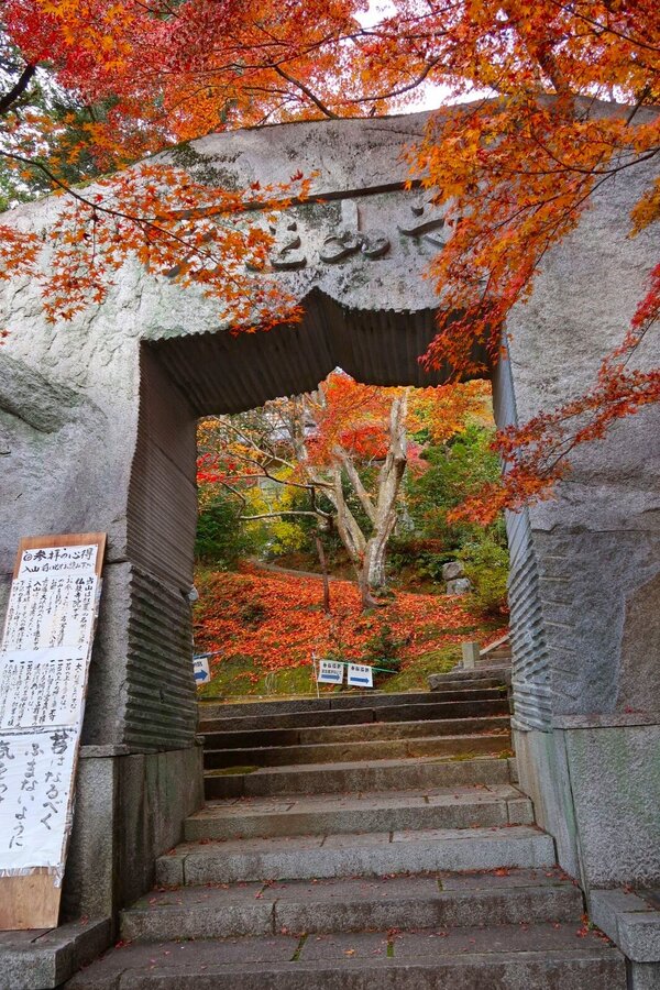 石造りの山門は象に似た形で、「丹山法窟」と刻まれている。