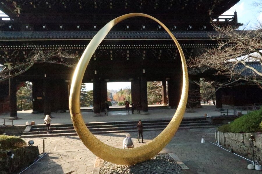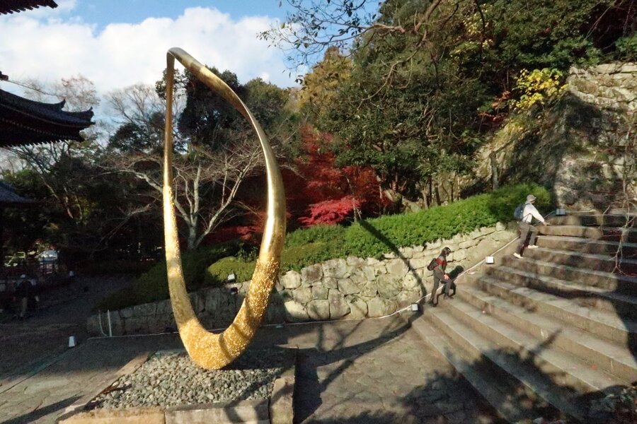 「茅の輪」を思わせるようなリング状のモニュメントが知恩院(山門と男坂の間)に登場した。関西万博のアイルランド館に設置されていた「マグナス・リン」。アイルランドの彫刻家が制作したもので、上部は木製、下部はブロンズ製で全体が金箔で覆われている。作者は日本と愛蘭土の文化の架け橋になればと願う。