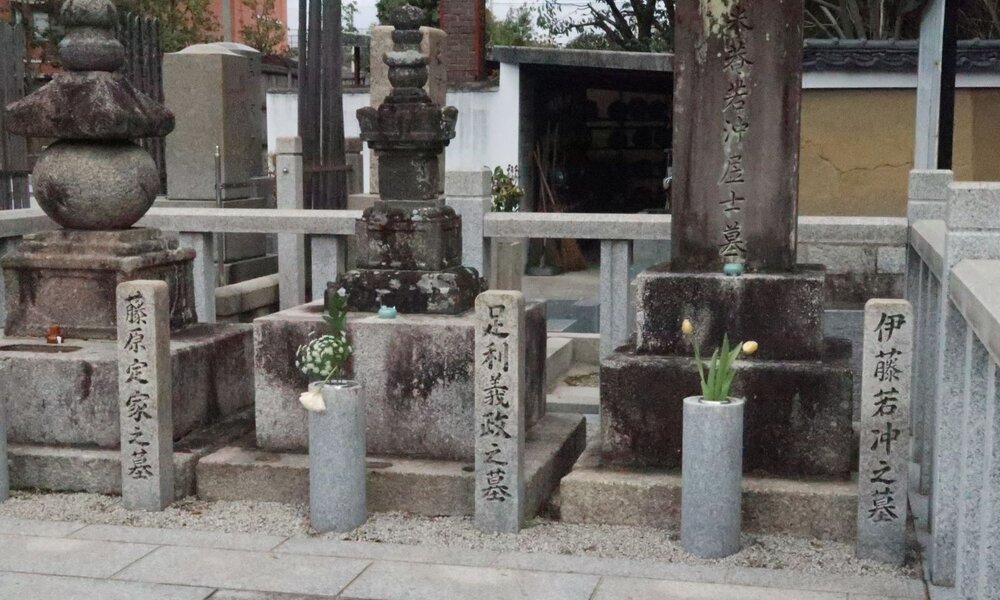 相国寺は「足利義政」によって再建される際に、冷泉家より「藤原定家」の墓所を含めた土地を寄進される。また「伊藤若冲」の禅の師匠が相国寺の住持という縁で明治から大正ごろの墓地の整備のときに、三名の墓が同じ場所に改葬された。なお藤原定家は晩年の邸宅「一条京極第跡」が、寺町二条上るにあるなど、3名とも相国寺に近い、ゆかりの人びとである。